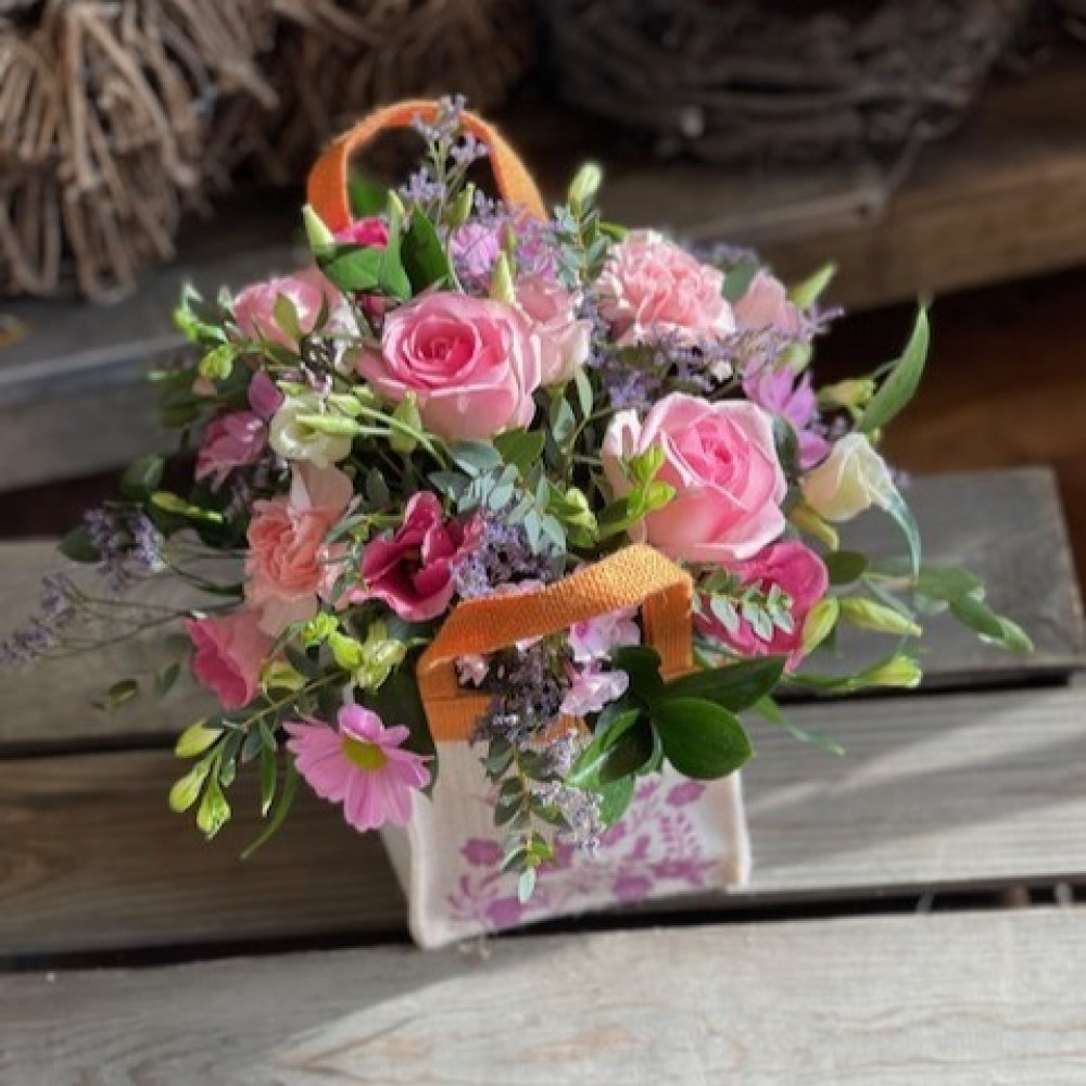 A gorgeous selection of seasonal fresh flowers and foliages in Pastel colours, chosen by our talented florists to create this Pretty little arrangment designed in oasis and presented in complimenting Hessian Bag so the lucky recipient can enjoy them straight away upon recieving them and get to have a keepsake bag afterwards.