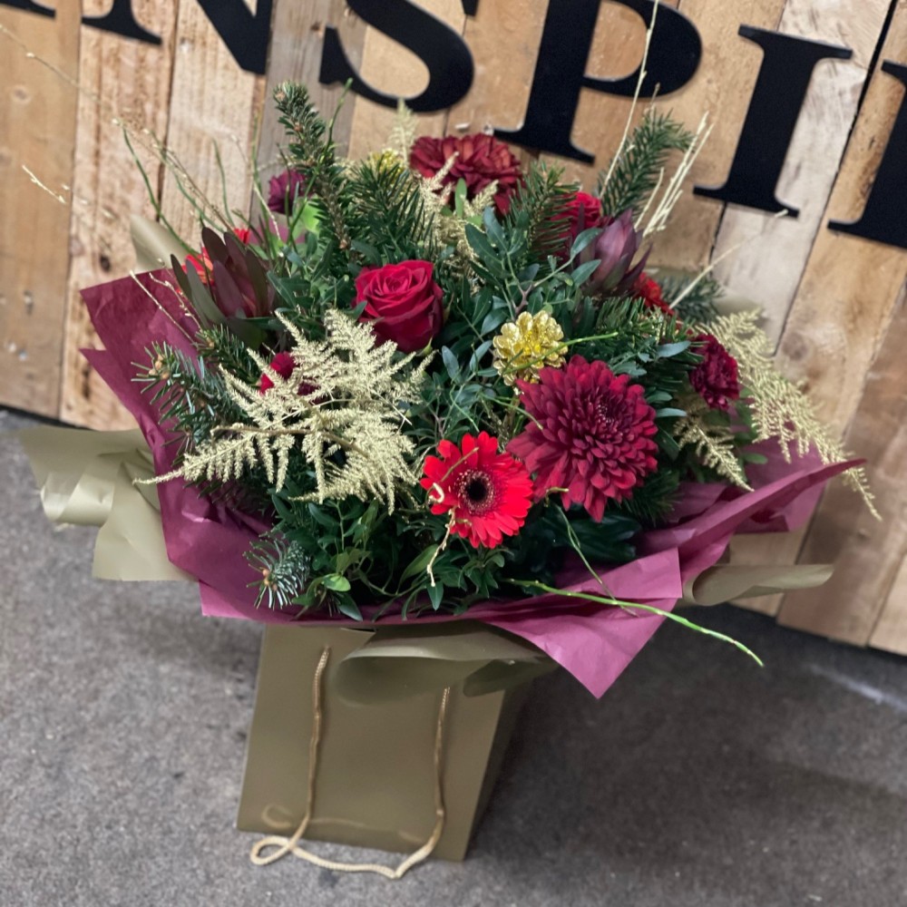 A gorgeous selection of Seasonal fresh flowers and foliages in Reds and Golds, chosen by our talented florists to create this beautiful Festive handtied Aqua. This design is gift wrapped in a bubble of water and presented in a complimenting gift bag so the lucky recipient can enjoy them straight away upon recieving them.