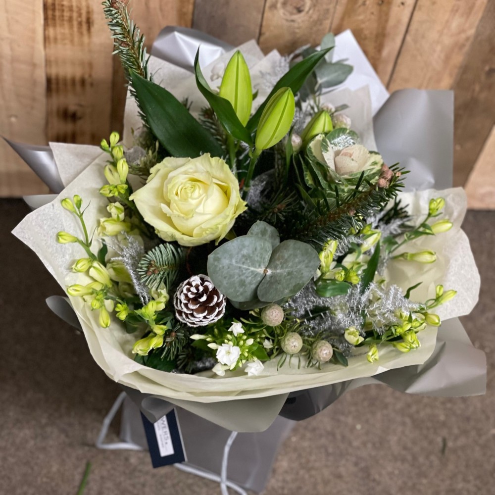 A gorgeous selection of Seasonal fresh flowers and foliages in Whites and Silver, chosen by our talented florists to create this beautiful Festive handtied Aqua. This design is gift wrapped in a bubble of water and presented in a complimenting gift bag so the lucky recipient can enjoy them straight away upon recieving them.